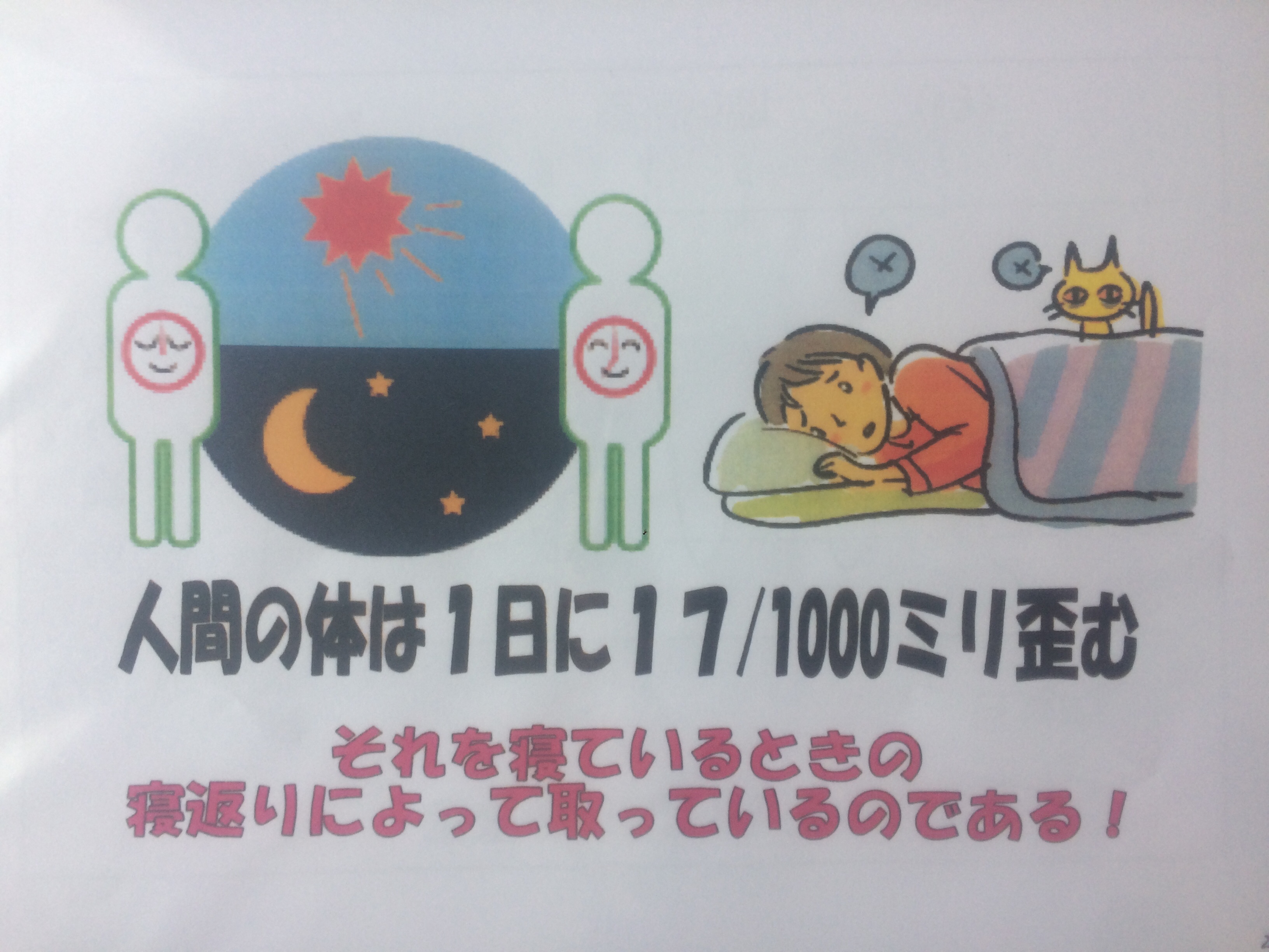 柔らかい布団に寝るなど、きちんと寝返りがうてない状態が続くと、整える事ができず、どんどん体が歪んできます。